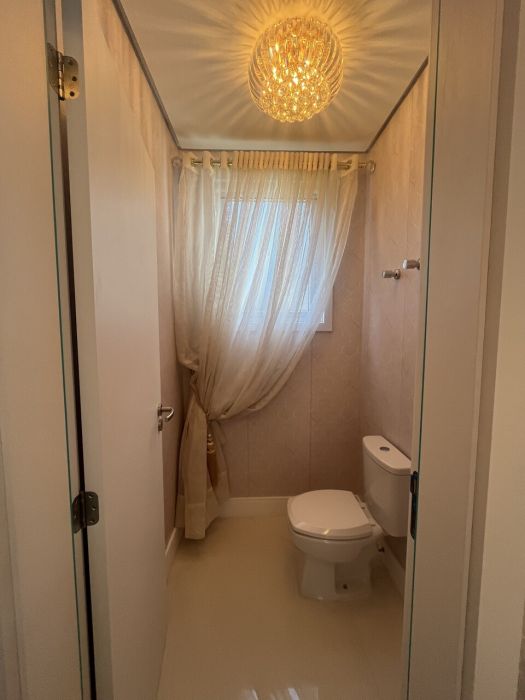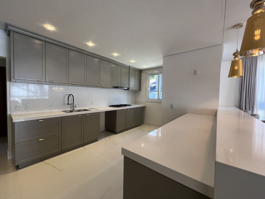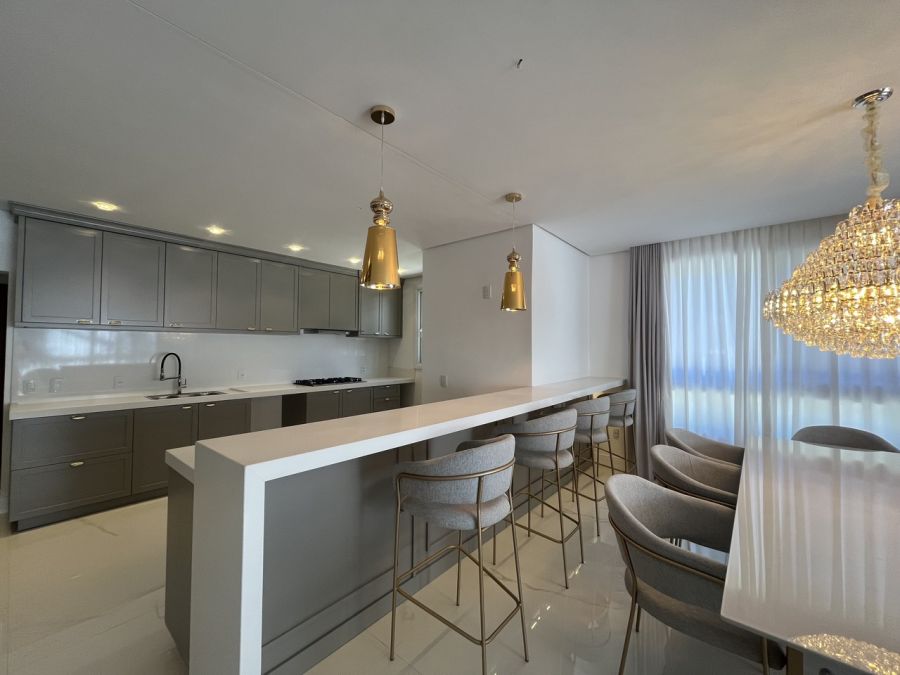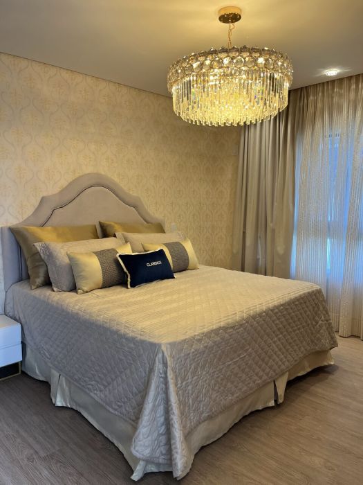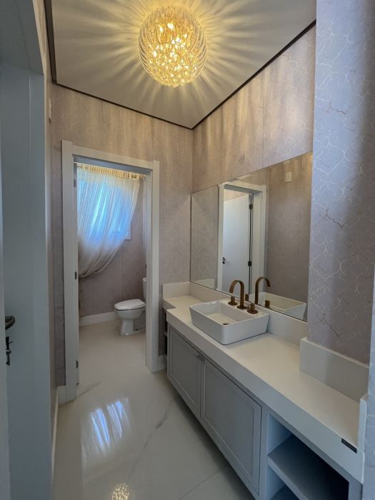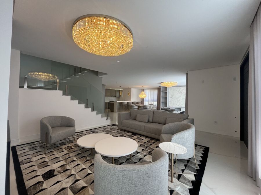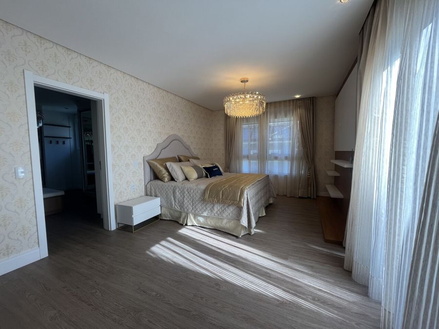 Residência mobiliada na sala, cozinha e suíte máster, alto padrão, com 371 mts de área privativa, terreno com área total de 800 mts, cozinha americana com churrasqueira mobiliada, sala de tv e jantar, living com lareira, 05 suítes, sendo duas no térreo e sendo a máster com closet, lavabo, lavanderia, garagem coberta para dois veículos com espera para carregador de carro elétrico.